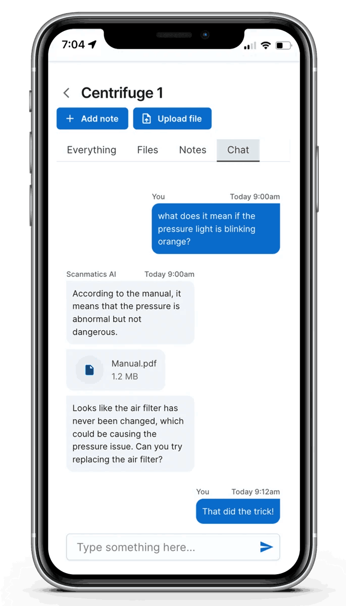 Learn more →Workers ask questions in plain language — "Why is motor 3 overheating?" — and get answers drawn directly from your linked documentation. 24/7, no engineering call required.